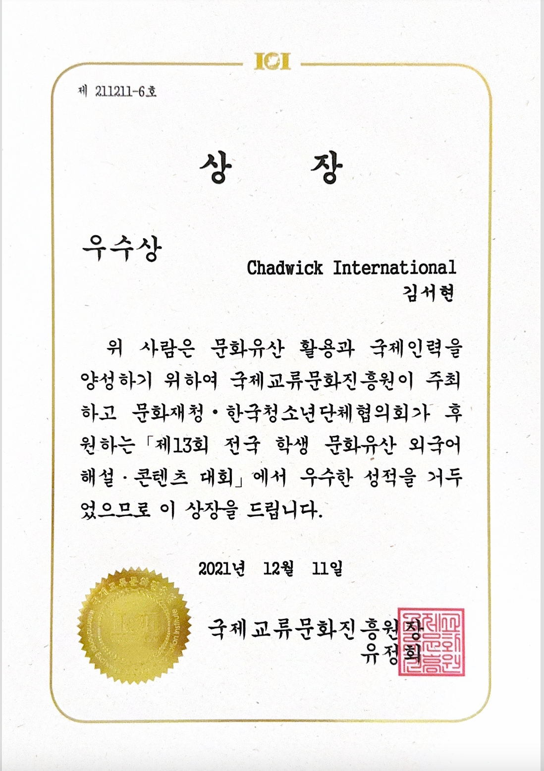 Since I was 8 years old, I have taken courses in history commentators, and based on them, I have qualified as a youth cultural commentator to explain Korea's cultural heritage. Based on this, I participated in a UCC youth history commentary competition hosted by the Ministry of Culture, Sports and Tourism and received the Excellence Award in the Middle and High School. I made a presentation about the "Jikji" of Korea, the first metal type in the world, and this video was created to help promote the Korean cultural festival to the world.