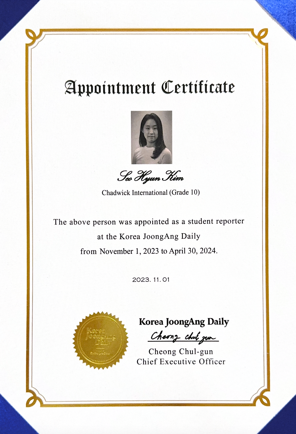 I was selected as a youth reporter for the largest newspaper in Korea. The Korea Joongang Daily is a newspaper published in English and provides services mainly to Koreans throughout the United States.