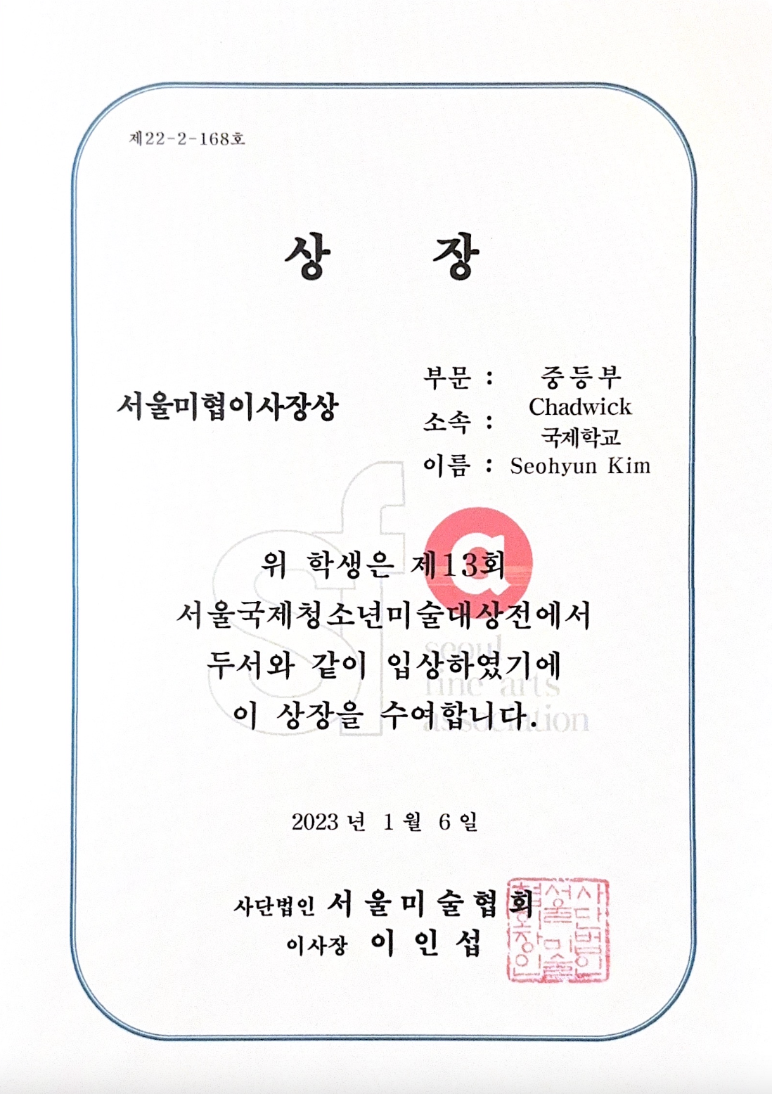 I participated in the Seoul Youth Art Competition, which is the largest youth art competition in Korea. During the COVID-19 period, when outside activities were limited, I was interested in the environment, education, and global politics, and I drew on that theme and participated in the competition and won the Seoul Arts Association President's Award, the top prize.