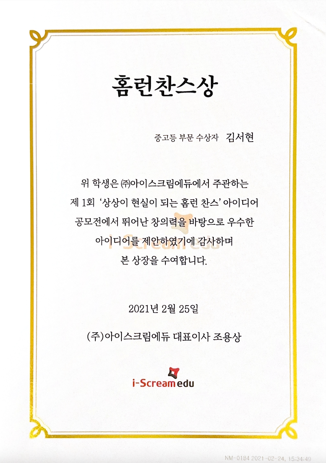 At the Educational Ideas Contest held by Ice Cream Edu, Korea's No. 1 e-learning company, we won the grand prize for middle and high school students. We won the grand prize for our idea of how to effectively improve English education methods to speed up learning foreign languages and expand them to communities to increase the efficiency of learning for a large number of children. We received the largest amount of money a student can receive, KRW 500,000, and based on this prize money, we created the H.O.P.E. (We Help Our Community member's Powerful English) program and have continued for three years.