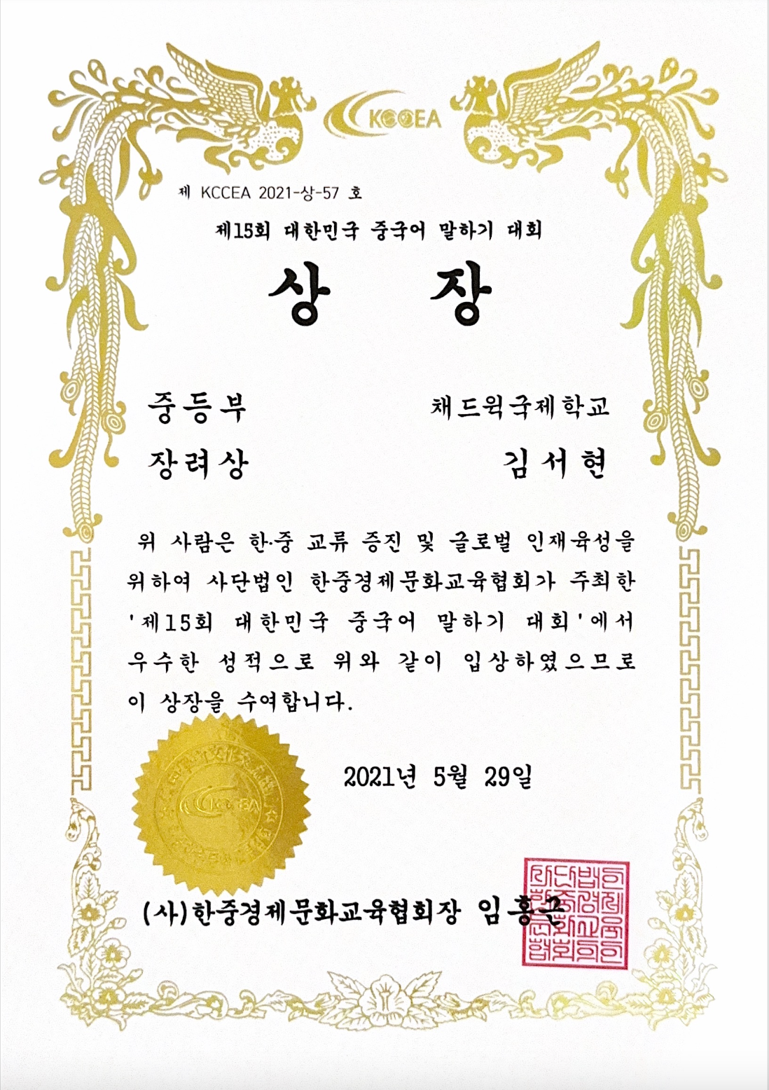 I learned Chinese from G1, participated in a Chinese speaking contest hosted in China, and won an encouragement award in the middle and high school, based on my experience in obtaining HSK3 level in Chinese. I gained confidence in speaking by participating in a speaking contest in Chinese even though I had no experience living in China, and I was recognized for my ability to speak my thoughts and arguments in Chinese.
