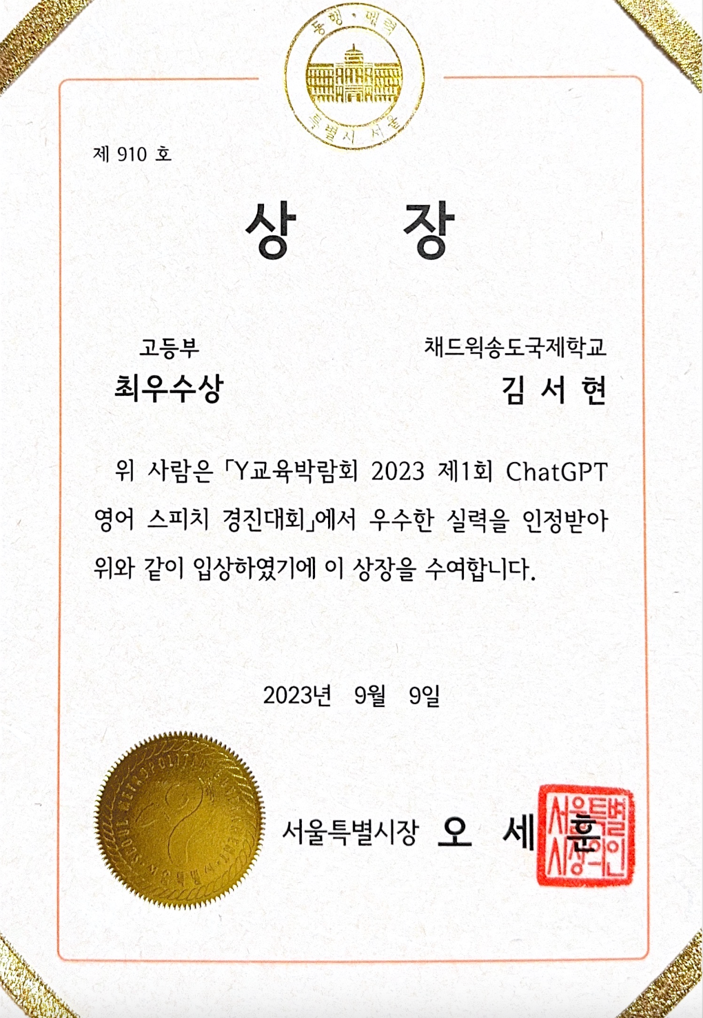 - In Seoul, Korea, a competition was held to make and present manuscripts on the spot using Chat GPT. The impromptu presentation in English using Chat GPT was a competition, and it was held in Seoul. In this competition, I received the Seoul Mayor's Award, the highest award, and a prize of 800,000 won.